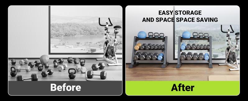 - Space-Saving Design: The 3-tier dumbbell rack features a compact storage space with an ergonomic and angled design, keeping all your dumbbells easily accessible. It allows you to place it in any part of your home or gym for convenient equipment accessibility