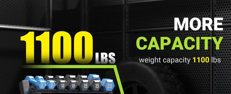 - Heavy-Duty Structure: The dumbbell stand is constructed with heavy-duty commercial-grade steel and a durable frame. The triangle base structure and solid welded construction make it exceptionally stable. With an impressive maximum weight capacity of 1100 lb, this weight stand can easily support heavy weights
